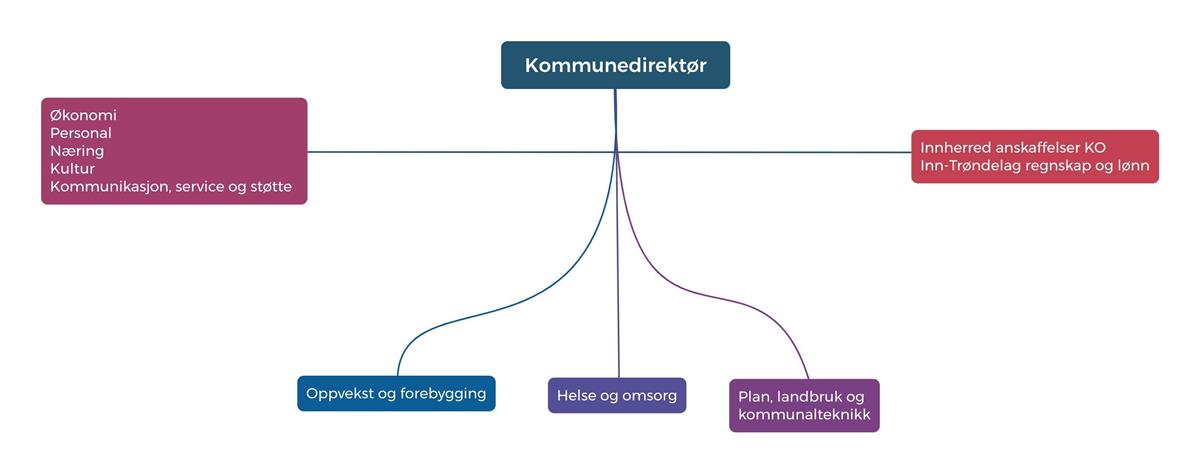 OrganisasjonskartKommunedirektøren er øverste administrative leder av kommunen og kommunedirektørens oppgaver er gitt i kommuneloven. Sist endret 28.10.2025 13:32 Øverste ledelse i kommunenKommunens øverste ledelse med stab og støttefunksjoner. De to interkommunale selskapene har Inderøy kommune vertskommuneansvar for.Oppvekst og forebyggingSektor oppvekst og forebygging i Inderøy kommune. Sektoren ledes av kommunalsjef oppvekst og forebygging.Helse og omsorgSektor helse og omsorg i Inderøy kommune. Sektoren ledes av kommunalsjef helse og omsorg.Plan, landbruk og kommunalteknikk
